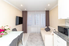 Продается однокомнатная квартира в жилом районе Европейский, отличающемся развитой и самодостаточной инфраструктурой. Объект предлагается в отличном состоянии с качественным свежим ремонтом: в прихожей и кухне-гостиной уложен практичный керамогранит, в спальной зоне — ламинат, стены оклеены обоями. Планировка оптимальна для комфортного проживания, кухня совмещена с гостиной, в прихожей установлен вместительный встроенный шкаф. Вся представленная мебель и бытовая техника могут быть переданы новому владельцу, что позволяет заселиться сразу после сделки. Район обеспечивает все повседневные потребности в шаговой доступности: в радиусе 100 метров расположены магазины первой необходимости, в пределах километра — крупные торговые центры, включая «Ленту», рынки, спортивные и фитнес-клубы, салоны красоты, школы и детские сады. Транспортная доступность позволяет быстро выехать в любую часть города. Квартира идеально подойдет для тех, кто ценит готовые решения, удобство расположения и стремится к быстрому заселению без дополнительных вложений. Готовность к оперативному проведению сделки.