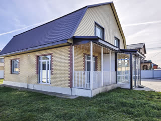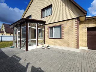 Придомовая территория выложена брусчаткой, есть парковочное место. По периметру всего участка забор из профлиста.