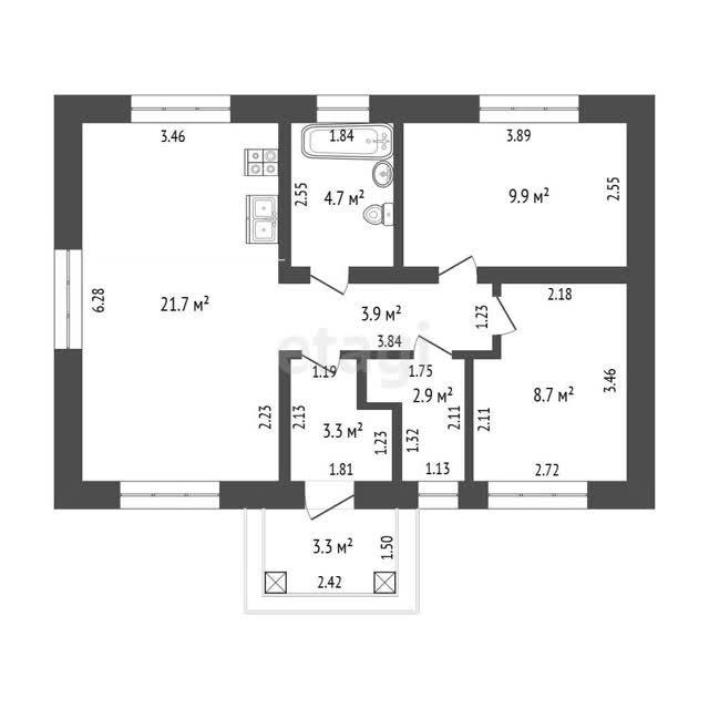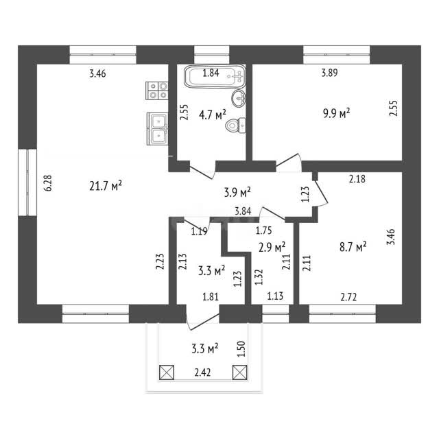 ✔ Планировка: кухня-гостиная 21,7 м² и 2 спальни, оптимально для семьи